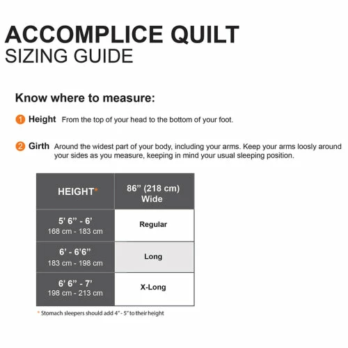 The ultimate 2-person quilt! With a closed footbox and individual draft control, the Accomplice is the perfect quilt for couples looking to lighten their load on the trail. A proprietary draft blocker at the head end keeps warmth inside, and the individual neck and side openings allow each person to adjust for comfort in a wide range of temperatures.