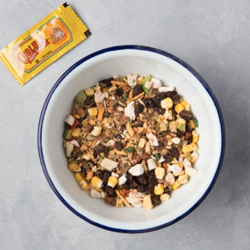 Diced chicken with black beans, brown rice, spinach, roasted corn, cheddar cheese & Cholula hot sauce