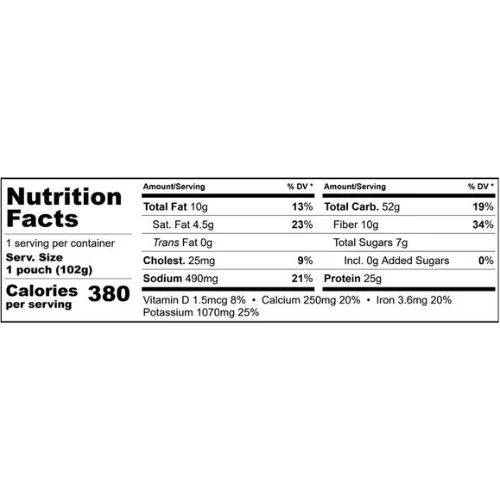 Single serving: 380 calories, 25g protein, 10g fat, 52g carb.