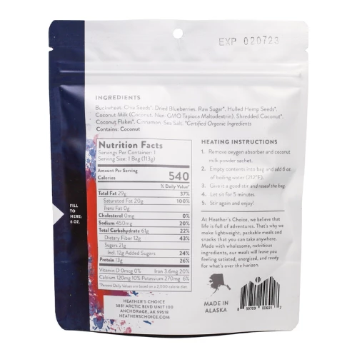 Because of Heather’s Choice’s affinity for wild blueberries, it was only natural to add a Blueberry Cinnamon Breakfast to their menu of backpacking foods. Their most popular dehydrated backpacking breakfast, they’re sure you will love this meal on a cold morning in the tent.