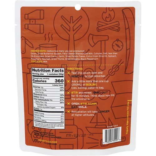 Ingredients: Onion, Dried Butternut Squash, Feta Cheese (Pasteurized Milk, Cultures, Salt, less than 1% Enzymes), Dried Carrot, Garlic, Dried Potato Flakes, Extra Virgin Olive Oil, Spinach, Rosemary, Sea Salt, Dried Thyme, Dried Oregano, Black Peppercorn