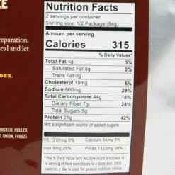 Single serving: 315 calories, 21g protein, 0g fat, 44g carb.