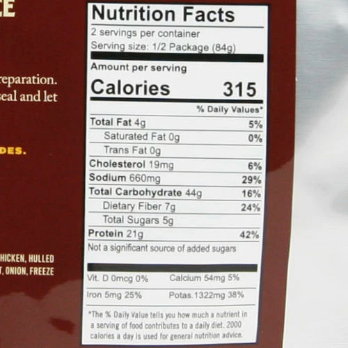 Ingredients: Parboiled Long Grain Rice (Rice, Niacin, Iron, Thiamin, Folic Acid), Freeze Dried Cooked Chicken, Cajun Smack Seasoning (Brown Sugar, Salt, Spices, Paprika, Garlic, Onion), Onion, Freeze Dried Broccoli, Freeze Dried Green Bell Pepper, Freeze Dried Red Bell Pepper