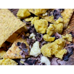 Ingredients: Tortilla Chips (Stone Ground Corn, Canola Oil, Lime & Sea Salt), Beans, Egg, Queso Panela (Cultured Pasteurized Grade A Milk, Sea Salt, And Enzymes), Onion, Cilantro, Salt, Garlic, Chile De Arbol, Canola Oil. Contains Less Than 0.5% Of Vegetable Flavor Base (Salt, Sugar, Soybean Oil. Onion Powder, Corn Starch, Maltodextrin, Hydrolyzed Corn Protein, Garlic Powder, Turmeric (Color), Spices, Carrot Juice Concentrate, Calcium Silicate (Anti-caking Agent), Caramel Color, Natural Flavors, Disodium Inosinate, Disodium Guanylate, Citric Acid).