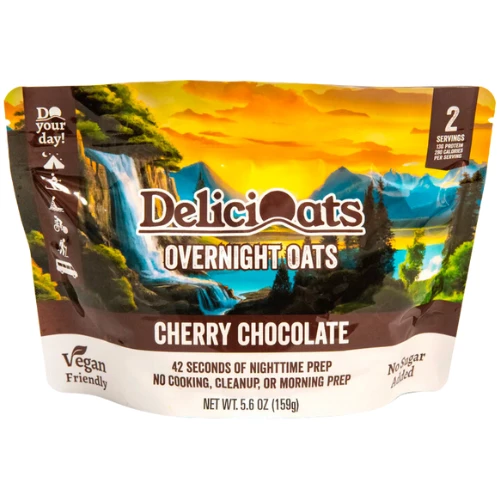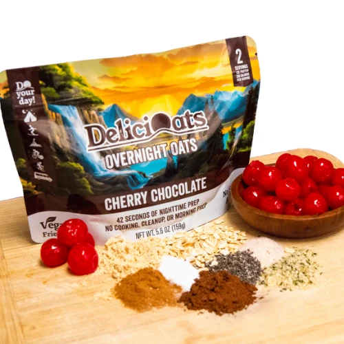 Ahh, the flavor that started it all. Inspired by the serendipity of having left over dutch oven cherry chocolate cobbler from the night before, and deciding to try it for breakfast in our overnight oats. When tart cherries + 100% real cocoa powder, and a bowl of overnight oats love each other very much…DeliciOats are conceived. (Don’t make it weird)