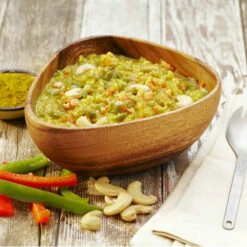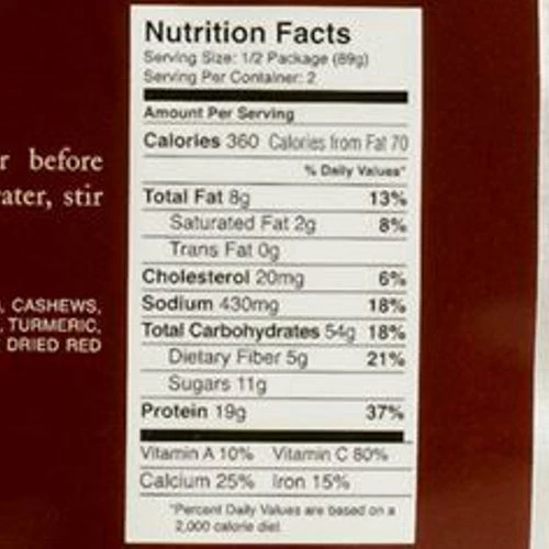 Ingredients: Parboiled Long Grain Rice (Rice, Niacin, Iron, Thiamin, Folic Acid), Cashews, Nonfat Milk (Vitamin A Palmitate, Vitamin D3), Freeze Dried Chicken, Curry (Spices, Turmeric, Salt, Red Pepper, Spice Extractives), Freeze Dried Green Bell Pepper, Freeze Dried Red Bell Pepper, Onion, Guar Gum