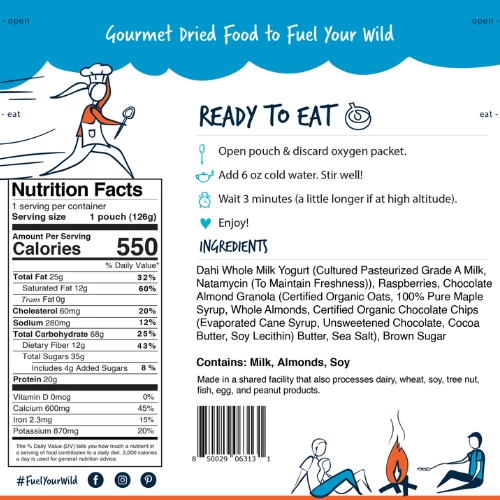 Each pouch contains an entire ½ pint of berries, delicious almond granola, organic chocolate chips, 100% pure maple syrup and yogurt. REAL yogurt. REAL creamy yogurt! They aren’t messin’ around.