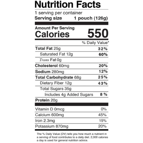 Single serving: 550 calories, 20g protein, 25g fat, 68g carb.