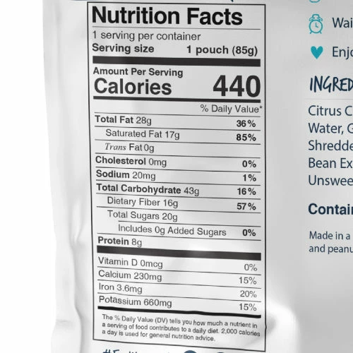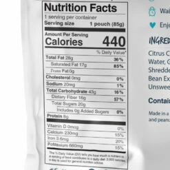 Single serving: 440 calories, 8g protein, 28g fat, 43g carb.