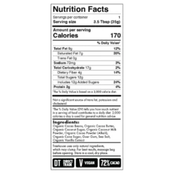 Ingredients: Cacao Beans, Coconut Nectar, Cane Sugar, Cocoa Powder, Coconut Milk Powder, Sea Salt, Guar Gum, Carob Bean Gum, Vanilla Bean