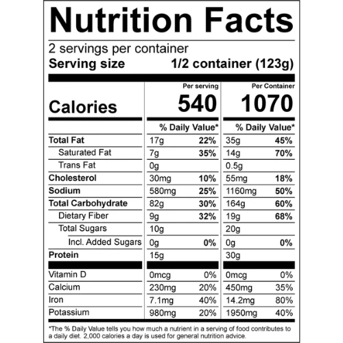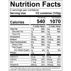 Single serving: 540 calories, 17g fat, 580mg sodium, 82g carb, 15g protein