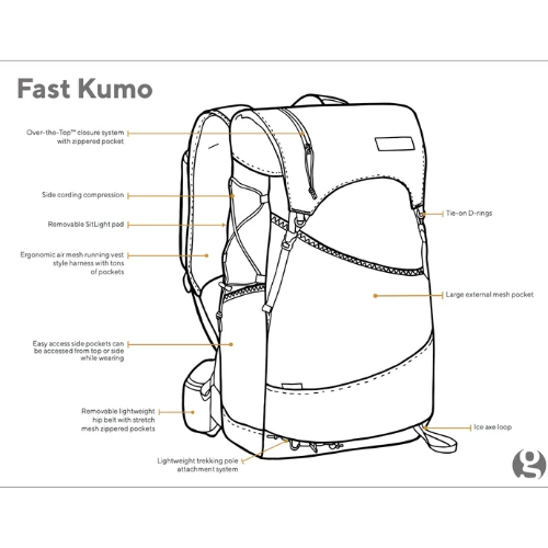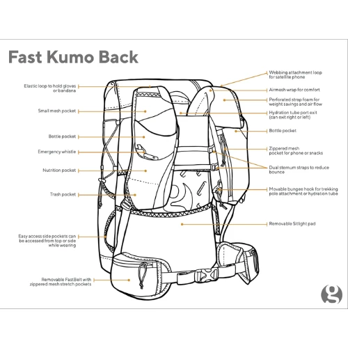 The Fast Kumo is a new spin on a Gossamer Gear classic. This pack has been re-designed with a vest-like fit and easy access storage to keep up with you at your fastest speeds.
