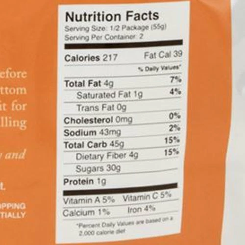 Peach Blueberry single serving: 251 calories, 2g protein, 4g fat, 50g carb.
