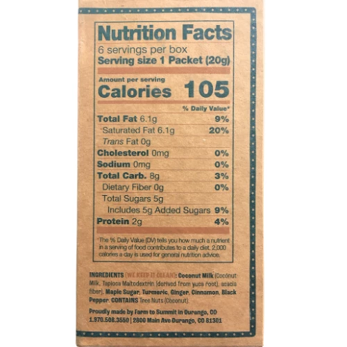 Ingredients: Organic Coconut Milk (Coconut Milk, Tapioca Maltodextrin (Derived From Yuca Root), Acacia Fiber), Maple Sugar, Turmeric, Ginger, Cinnamon, Black Pepper.