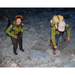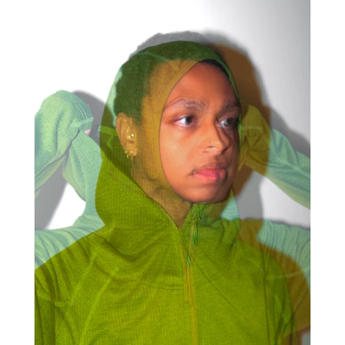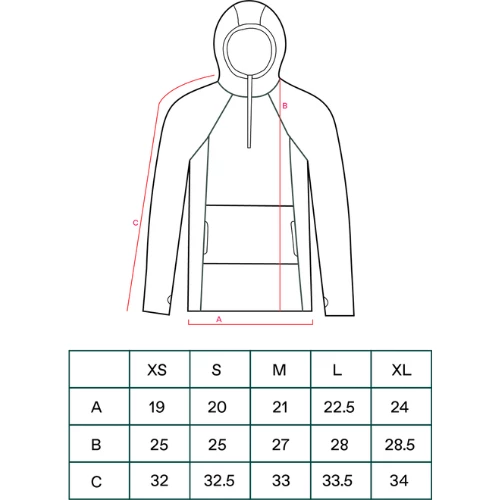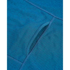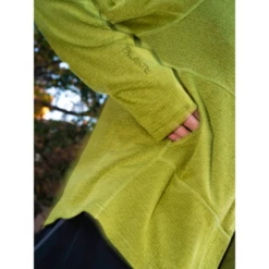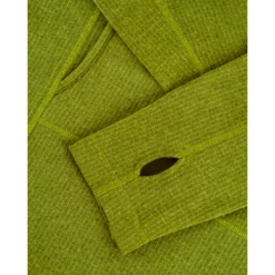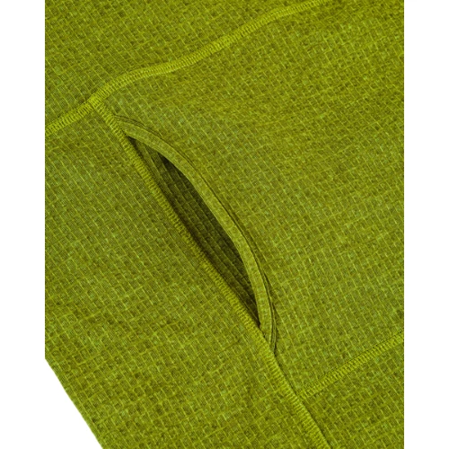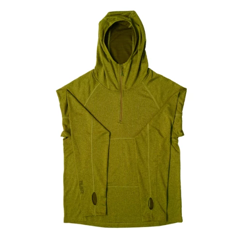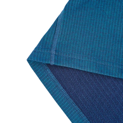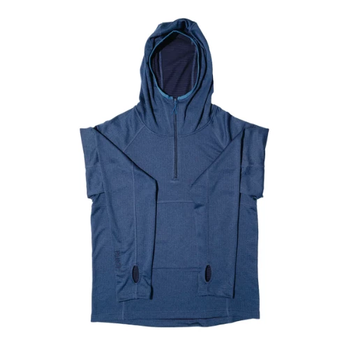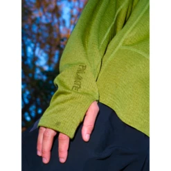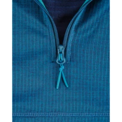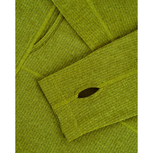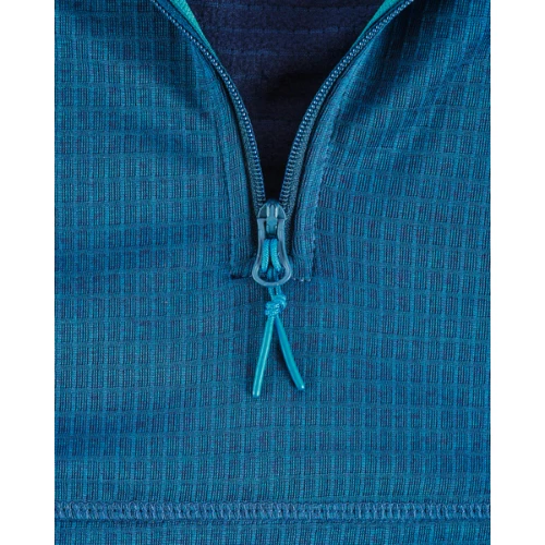 100% polyester grid fleece with a 1/4 zip for venting. Thumb-holes to keep palms warm and high pocket design for compatibility with hip belts.