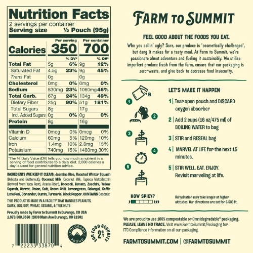 Ingredients: Jasmine Rice, Roasted Winter Squash (Delicata and Butternut), Coconut Milk (Coconut Milk, Tapioca Maltodextrin (Derived from Yuca Root), Acacia Fiber), Broccoli, Tomato, Zucchini, Yellow Squash, Carrot, Onion, Salt, Green Chili, Lemongrass, Galangal, Kaffir Lime Peel, Coriander, Cumin, Turmeric, Black Pepper.