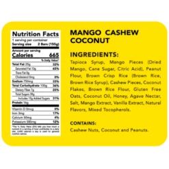 Ingredients: Tapioca Syrup, Mango Pieces (Dried Mango, Cane Sugar, Citric Acid), Peanut Flour, Brown Crisp Rice (Brown Rice, Brown Rice Syrup), Cashew Pieces, Coconut Flakes, Brown Rice Flour, Gluten Free Oats, Coconut Oil, Honey, Agave Nectar, Salt, Mango Extract, Vanilla Extract, Natural Flavors, Mixed Tocopherols.