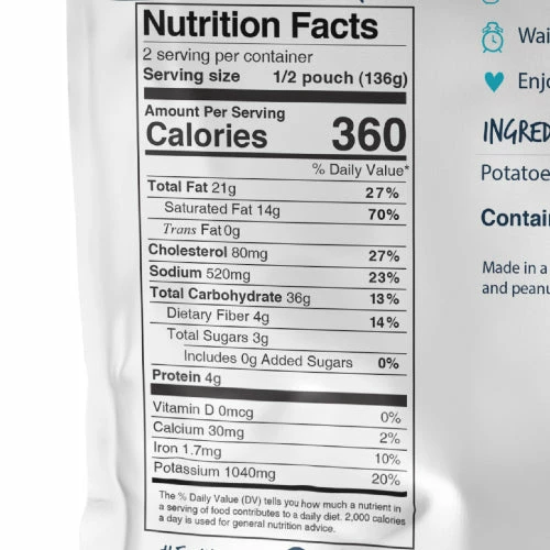 Single serving: 360 calories, 4g protein, 21g fat, 36g carb.