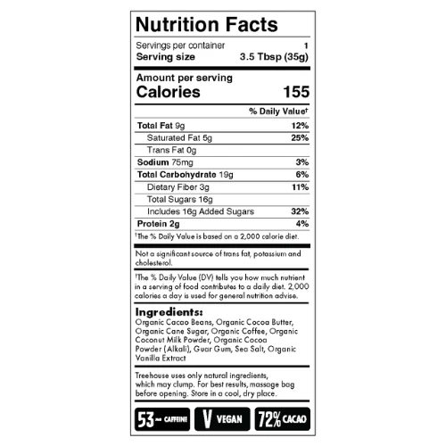 Ingredients:Â Cacao Beans*, Cane Sugar*, Cocoa Powder*, Coconut Milk Powder*, Coffee*, Sea Salt, Guar Gum, Carob Bean Gum, Vanilla Bean*