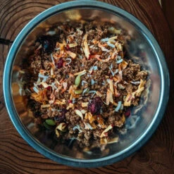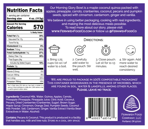 Ingredients: Coconut Milk, Water, Quinoa, Apples, Carrots, Pineapple (Pineapple, Pineapple Juice, Citric Acid), Coconut, Pecans, Dried Cranberries (Cranberries, Sugar), Brown Sugar, Maple Syrup, Cinnamon, Orange Zest, Pumpkin Seeds, Coconut Milk Powder, Salt, Cardamom, Ginger, Vanilla Extract (Vanilla Bean Extractives in Water, Alcohol).