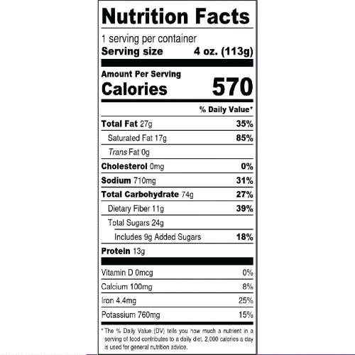 Single serving: 570 calories, 13g protein, 27g fat, 74g carb.