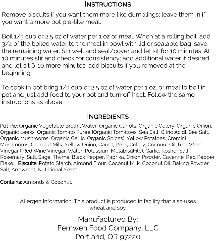 Pot Pie: Vegetable Broth* (Water, Carrots*, Celery*, Onion, Leeks*, Tomato* Puree [Tomatoes*, Sea Salt, Citric Acid], Sea Salt, Mushrooms*, Garlic*, Spices*), Yellow Potatoes*, Cremini Mushrooms, Coconut Milk, Yellow Onion, Carrot, Peas, Celery, Coconut Oil, Red Wine Vinegar (Red Wine Vinegar, Water, Potassium Metabisulfate), Garlic, Rosemary, Kosher Salt, Sage, Thyme, Black Pepper, Paprika, Onion Powder, Cayenne, Red Pepper Flake.
