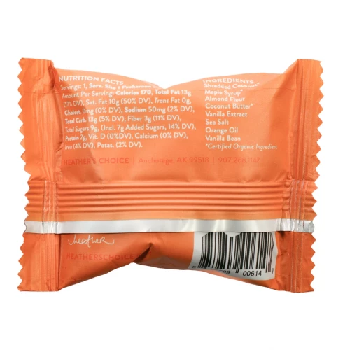 Ingredients: Shredded Coconut*. Maple Syrup*. Almond Flour. Coconut Butter*. Vanilla Extract. Sea Salt. Orange Oil. Vanilla Bean. *=Certified Organic Ingredient