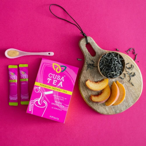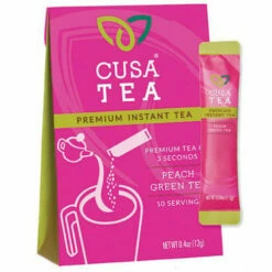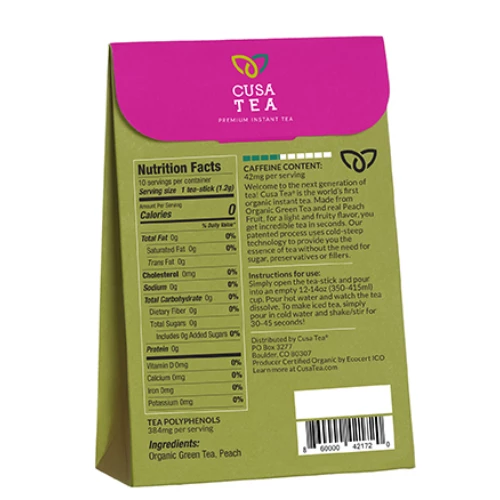 Peach Green Tea Tea has a light and fragrant peach flavor with just enough of the bite of green tea. Enjoy it hot or iced. Made with 100% Organic Green Tea and Real Peach Fruit, it contains no sugar, additives, fillers or preservatives. We do the brewing for you, so you can never over-steep this tea – you will get a consistent, full-flavor cup every time.