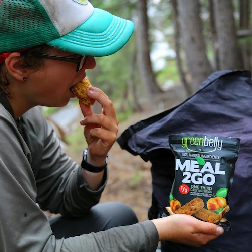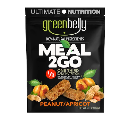 Goodbye 200 calorie snack bars. Each Greenbelly Meal pouch comes with two meal bars inside that provide a whopping 650 calories AND a balanced nutritional profile. As in over 25% of your Daily Value for six core nutrients: Calories, Carbohydrates, Protein, Sodium, Fat and Fiber. Weighing in approximately 5.5 oz, these things will keep you full while you crush miles.