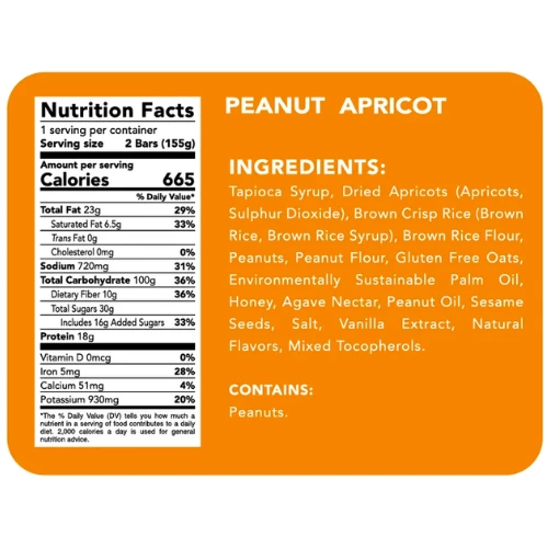 Ingredients:Â Tapioca Syrup, Dried Apricots (Apricots, Sulphur Dioxide), Brown Crisp Rice (Brown Rice, Brown Rice Syrup), Brown Rice Flour, Peanuts, Peanut Flour, Gluten Free Oats, Environmentally Sustainable Palm Oil, Honey, Agave Nectar, Peanut Oil, Sesame Seeds, Salt, Vanilla Extract, Natural Flavors, Mixed Tocopherols.