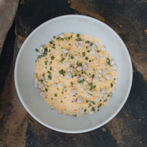 Italian corn polenta with breakfast sausage crumbles & garlic herbed parmesan cheese