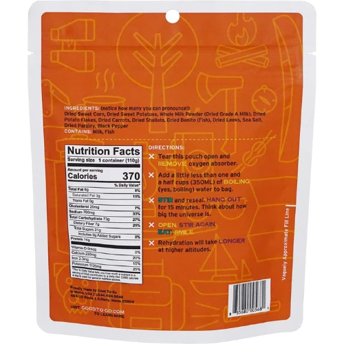 Ingredients: Dried Sweet Corn, Dried Sweet Potatoes, Whole Milk Powder (Dried Grade A Milk), Dried Potato Flakes, Dried Carrots, Dried Bonito (Fish), Dried Shallots, Dried Leeks, Sea Salt, Dried Parsley, Black Pepper