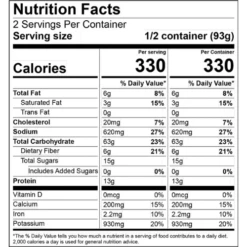 Single serving: 330 calories, 6g fat, 620mg sodium, 63g carb, 13g protein
