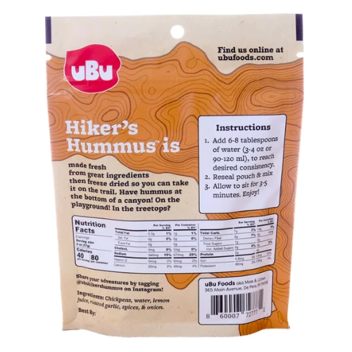 uBu’s Roasted Garlic Hiker’s Hummus is made in small batches from great ingredients then freeze-dried. Just add water, mix, and enjoy.Â