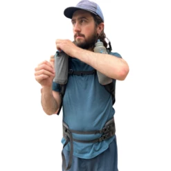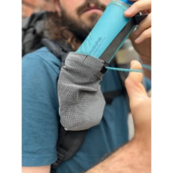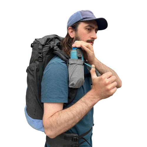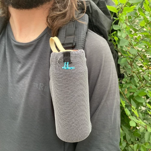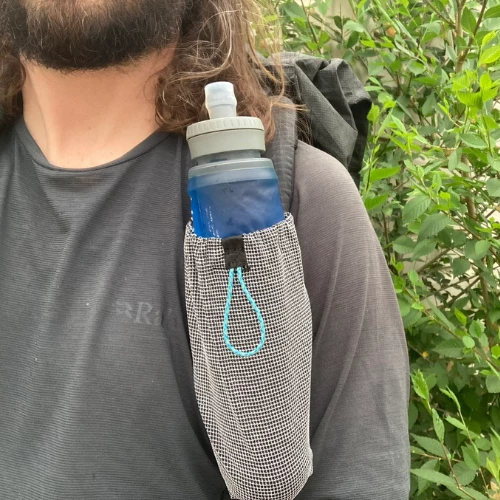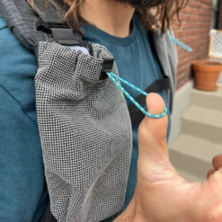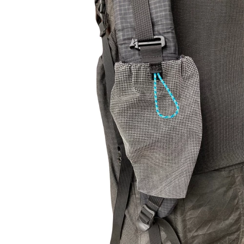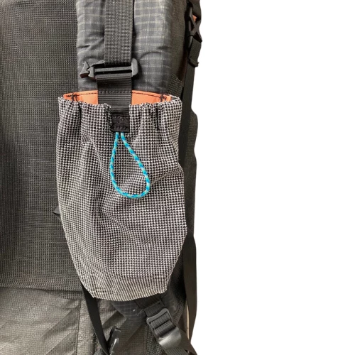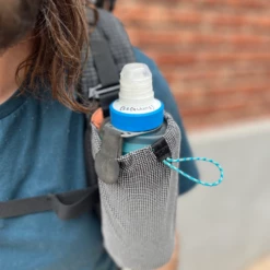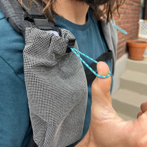 Shoulder strap pocket made to carry water bottles, phones, and more. Made from venom stretch mesh and weighing in at 0.7oz. A small loop allows you to expand the opening with your thumb for easily stowing and removing bottles.