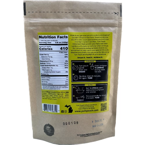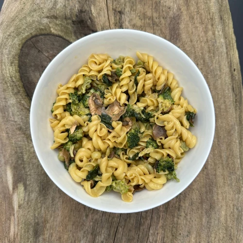 Ingredients: Durum Wheat Semolina Pasta, Whole Milk Powder, Mushrooms, Broccoli, Peas, Nutritional Yeast, Spinach, Tapioca Starch, Onion, Garlic, White Wine, Rosemary, Sea Salt, Onion Powder, Turmeric, Celery Salt, Thyme, Oregano, Basil, Marjoram.