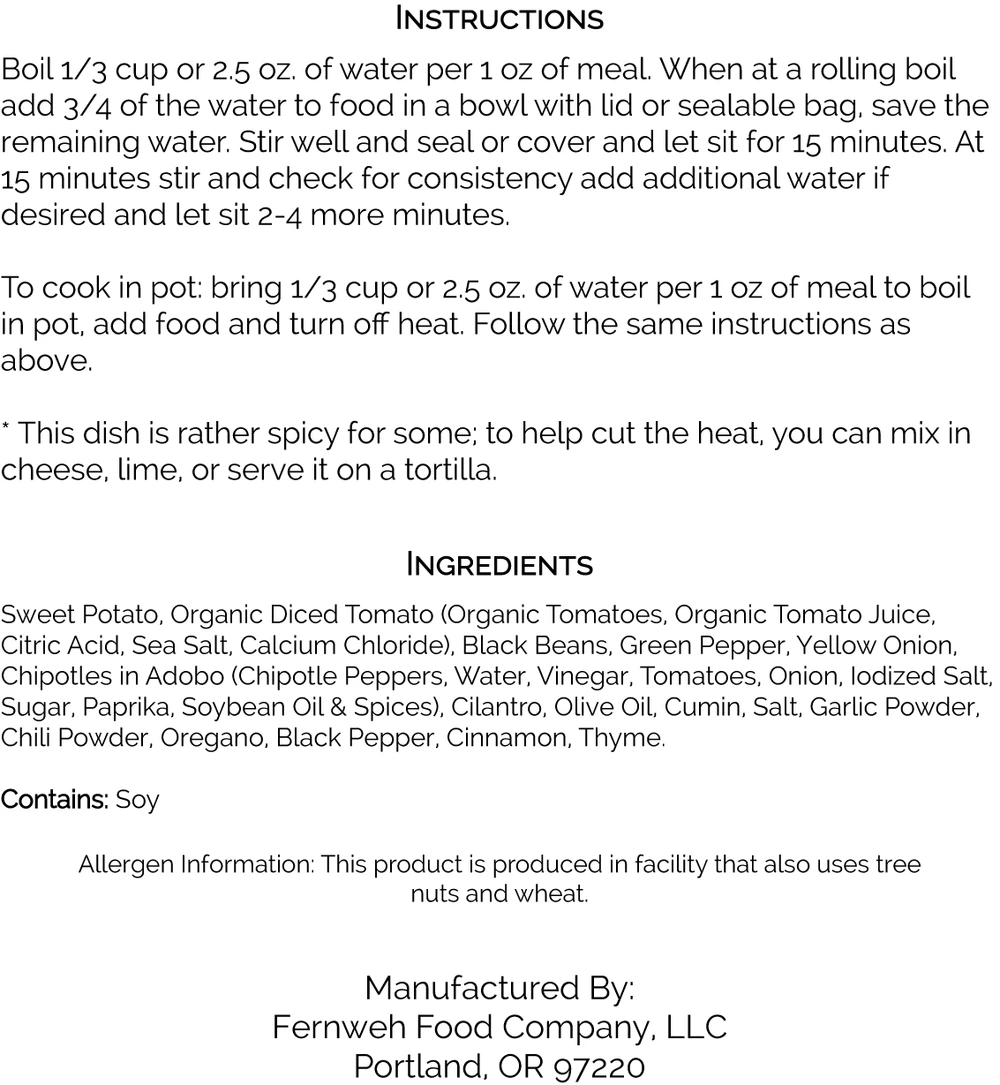 Ingredients: Sweet Potato, Diced Tomatoes (Tomatoes, Tomato Juice, Sea Salt, Citric Acid, Calcium Chloride), Onion, Black Beans, Green Peppers, Cilantro, Chipotles in Adobo (Chipotle Peppers, Vinegar, Tomatoes, Onions, Sugar, Salt, Paprika, Soybean Oil and Spices), Garlic, Olive Oil, Cumin, Garlic Powder, Kosher Salt, Chili Powder, Black Pepper, Oregano, Cinnamon, Thyme.