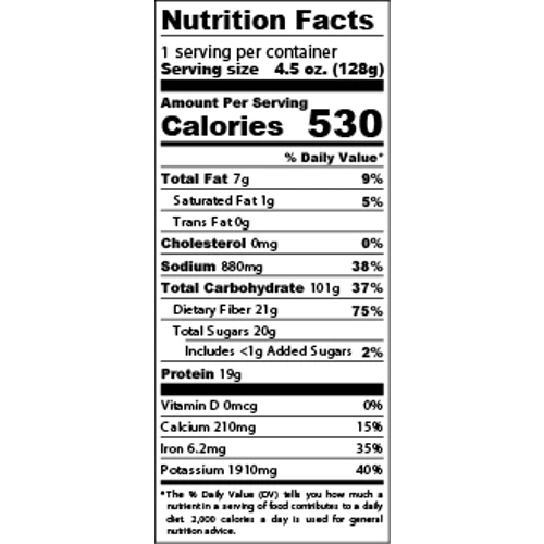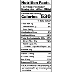 Single serving: 530 calories, 19g protein, 7g fat, 101g carb.
