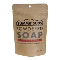 Like all backpackers, you only want to carry what you need, and unless you are backpacking for months at a time, you don’t need to bring 3oz of soap. We know you are just going put the soap in a smaller container. Which is why Summit Suds comes in a large compostable pouch – why give you a plastic container you will eventually throw away? We recommend reusing a travel size hand sanitizer bottle.