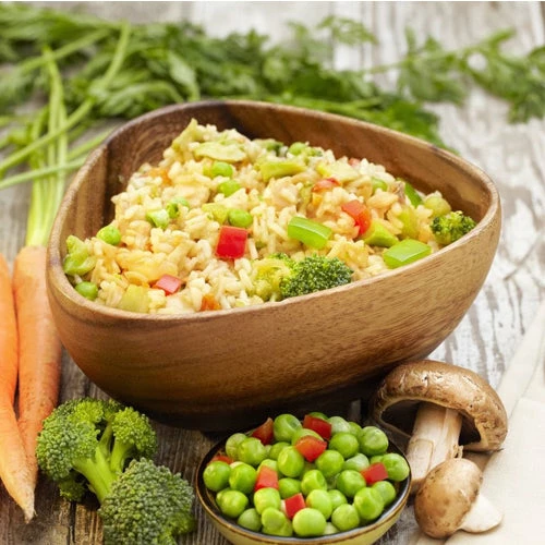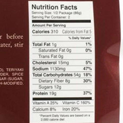 Ingredients: Parboiled Long Grain Rice (Rice, Niacin, Iron, Thiamin, Folic Acid), Teriyaki Sauce (Soy Sauce (Wheat, Soybeans, Salt), Wine, Vinegar, Salt, Onion Powder, Spice Extractives), Freeze Dried Cooked Chicken, Freeze Dried Broccoli, Brown Sugar (Sugar, Cane Molasses), Freeze Dried Peas, Freeze Dried Mushrooms, Food Starch-modified, Onion, Freeze Dried Red Bell Pepper, Garlic