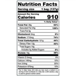 Single serving: 420 calories, 18g protein, 23g fat, 55g carb
