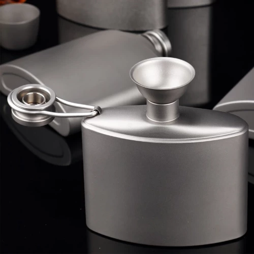 Made entirely from titanium the funnel is ultralight, weighing only 6.5g/ 0.22 oz. The funnel’s height and width are 40mm/1.57 inches. It is compact, strong, and durable. The design features a nozzle as well as 3 airflow slots which help ensure a good flow when pouring. To pour hold your hip flask with the funnel inside at approximately a 45-degree angle.Â