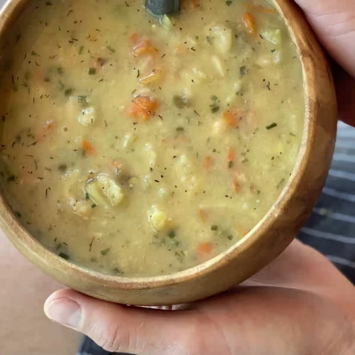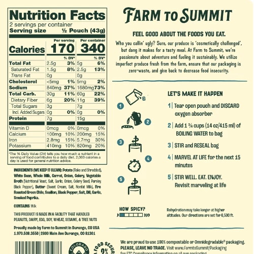 Ingredients: Potato (Flake and Shredded), White Bean, Whole Milk, Carrot, Onion, Celery, Vegetable Broth (Nutritional Yeast, Salt, Garlic, Onion, Celery Seed, Parsley, Black Pepper), Butter (Sweet Cream, Salt, Nonfat Milk), Fire-Roasted Green Chile, Scallion, Black Pepper, Salt, Dill, Garlic, Smoked Paprika.